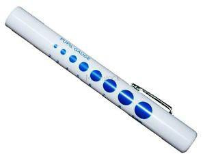 Pen Torch, Disposable with Pupil Gauge. 6 Box. This disposable diagnostic pen torch features a pupil gauge and an integrated pocket clip when pressed against the barrel illuminates the torch. Releasing the clip will turn the light off.