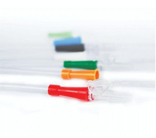 Presenting the PRO-Breathe Suction Catheters with a 6 Fr size, featuring a Funnel and Control Adapter. These catheters enable clinicians to swiftly detect blockages. The catheter is equipped with a gentle, atraumatic tip that includes a double offset eye, ensuring unobstructed function even if the distal hole is blocked. Its smooth surface guarantees a comfortable insertion process. The catheter offers versatility with a variety of connector ends, ensuring compatibility with a range of suction units and aspirators. For easy size recognition, it is conveniently color coded.