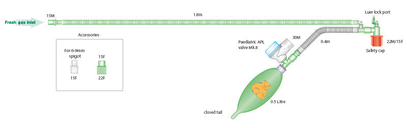 Veterinary Ayres infant T-piece type circuit breathing system with apl valve and 0.5Litre closed tail bag, 1.8metre length, ideal for vets anaesthesia on small animals. this has apl valve for scavenging away gases. A modification of the Jackson-Rees system, the 2122 offers the facility to scavenge waste gases which is very difficult to do with a conventional Jackson-Rees system.